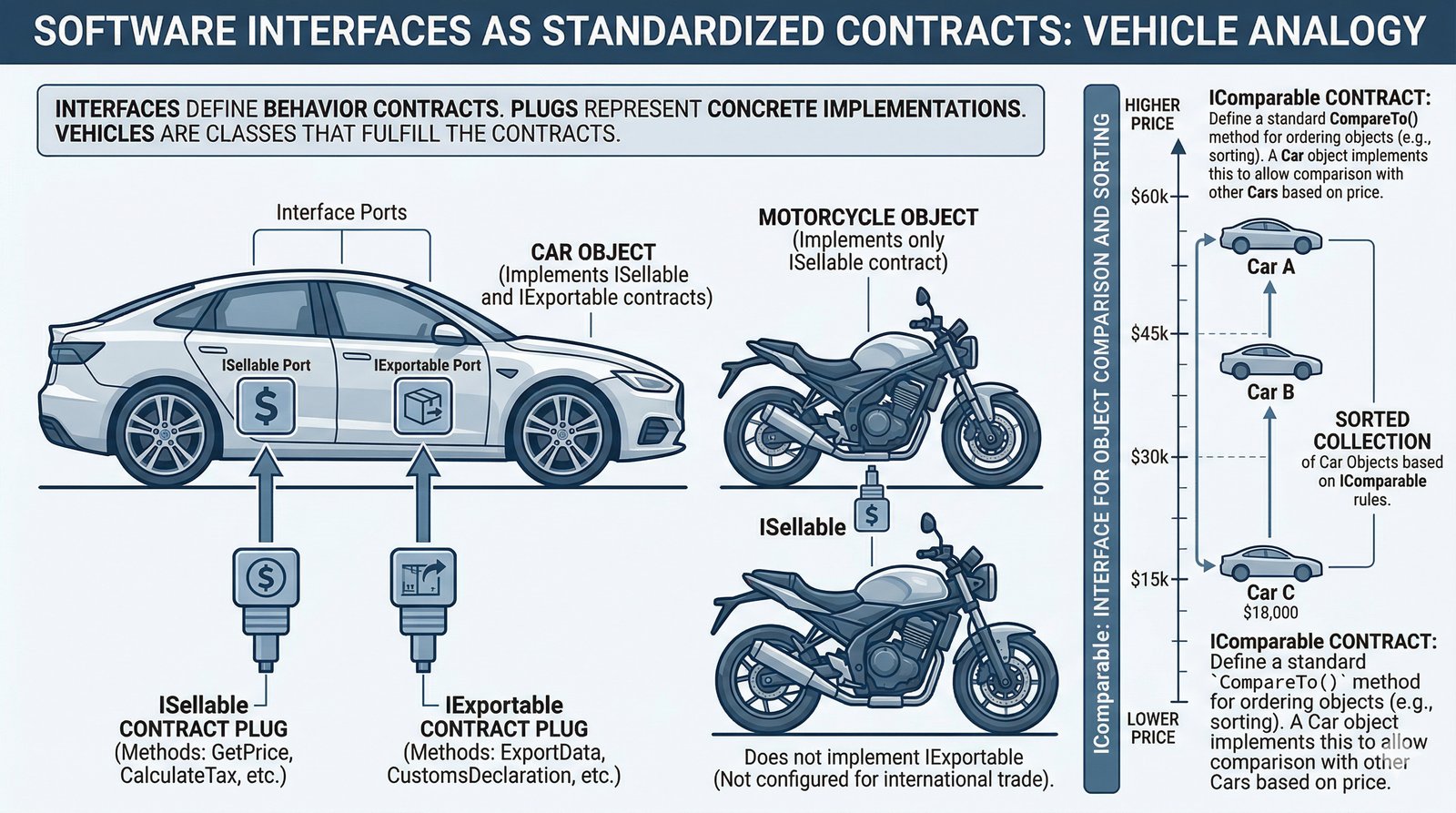 Postanawiasz wprowadzić interfejsy ISprzedawalny i IEksportowalny. Dzięki nim możesz potraktować zupełnie różne obiekty jako grupę elementów "sprzedawalnych" i wyliczyć dla nich łączną wartość, nie martwiąc się czy dany element ma koła, czy silnik. Dodatkowo, aby Twój system był bardziej przyjazny dla klienta, implementujesz standardowy interfejs IComparable. Dzięki niemu lista pojazdów na stronie internetowej komisu będzie mogła zostać automatycznie posortowana od najtańszego do najdroższego auta za pomocą jednego polecenia. To dowód na to, jak wielka moc drzemie w standaryzacji kodu za pomocą interfejsów.