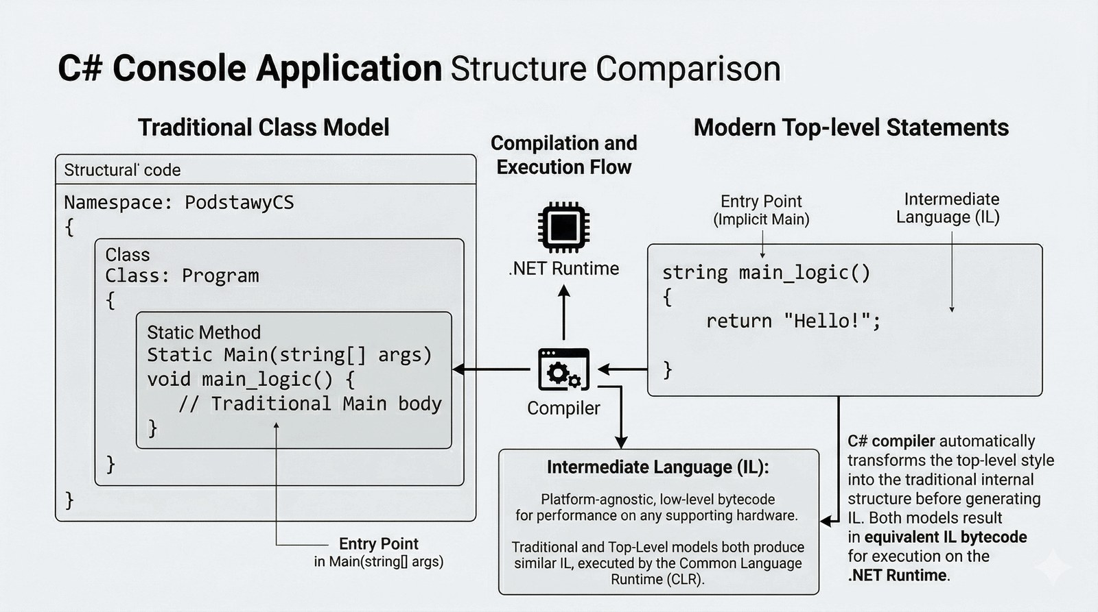 Zapoznanie studenta z podstawową strukturą pliku źródłowego w języku C#. Zrozumienie różnicy między modelem klasowym a instrukcjami najwyższego poziomu (Top-level statements).