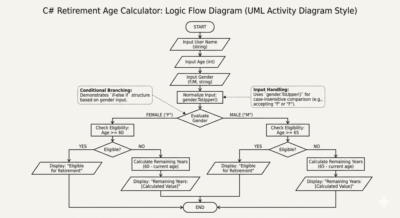 W tym zadaniu napiszemy program, który symuluje prosty system kadrowy sprawdzający uprawnienia emerytalne. Użytkownik zostanie poproszony o podanie swojego imienia, aktualnego wieku oraz płci (oznaczonej jako 'K' dla kobiet i 'M' dla mężczyzn). Program musi uwzględnić polskie przepisy prawa pracy, według których wiek emerytalny dla kobiet wynosi 60 lat, a dla mężczyzn 65 lat. Wykorzystując instrukcje warunkowe if oraz else if, program powinien sprawdzić, czy użytkownik osiągnął już wymagany wiek. Jeśli tak, wyświetli radosną informację o prawie do odpoczynku. W przeciwnym razie obliczy, ile dokładnie lat pozostało do osiągnięcia limitu. Ważnym aspektem zadania jest obsługa wejścia tak, aby litery 'k'/'m' były traktowane tak samo jak wielkie 'K'/'M'. To zadanie uczy logicznego myślenia oraz umiejętności rozgałęziania przepływu programu na podstawie danych wejściowych.