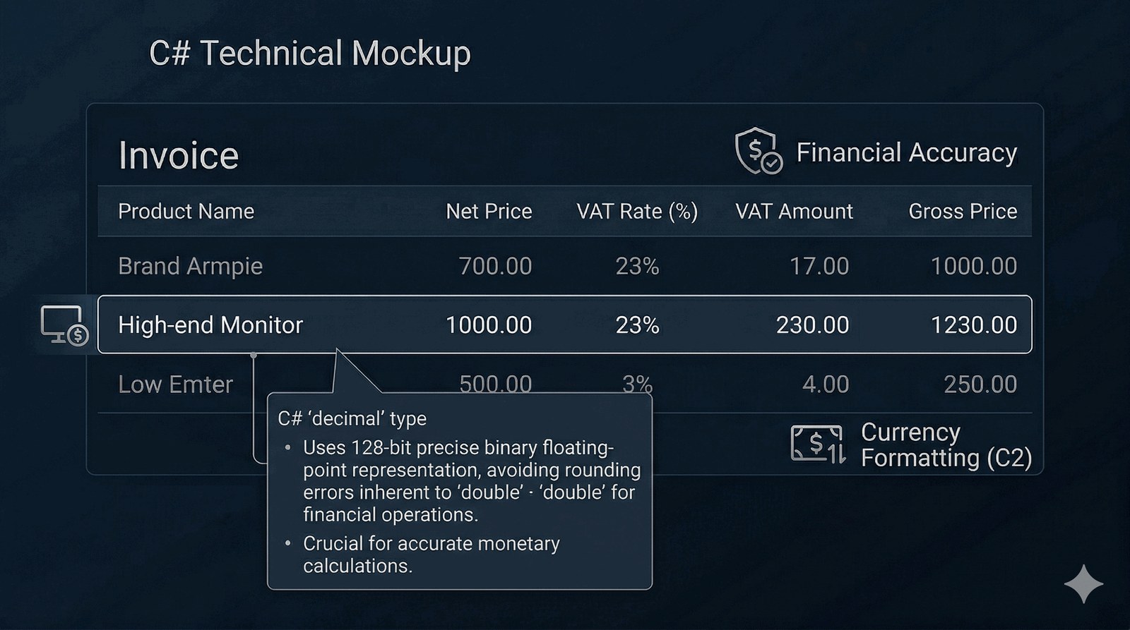 Zadanie polega na stworzeniu nowoczesnego kalkulatora zakupowego, który precyzyjnie oblicza koszty produktów. Użytkownik wprowadza nazwę towaru, jego cenę netto oraz stawkę podatku VAT wyrażoną w procentach (np. 23). Program musi wykonać szereg operacji matematycznych: obliczyć kwotę podatku oraz cenę brutto za jedną sztukę. Dodatkowo program pyta o liczbę zakupionych sztuk i oblicza łączną wartość zamówienia. Kluczowym elementem zadania jest użycie typu danych decimal zamiast double, co jest profesjonalnym standardem przy obliczeniach finansowych ze względu na eliminację błędów zaokrągleń. Wyniki powinny być wyświetlone w czytelny sposób, z użyciem formatowania walutowego (np. symbol zł dodawany automatycznie przez system). Uczeń dowie się, jak operować na liczbach zmiennoprzecinkowych i jak prezentować dane w sposób profesjonalny dla użytkownika końcowego.