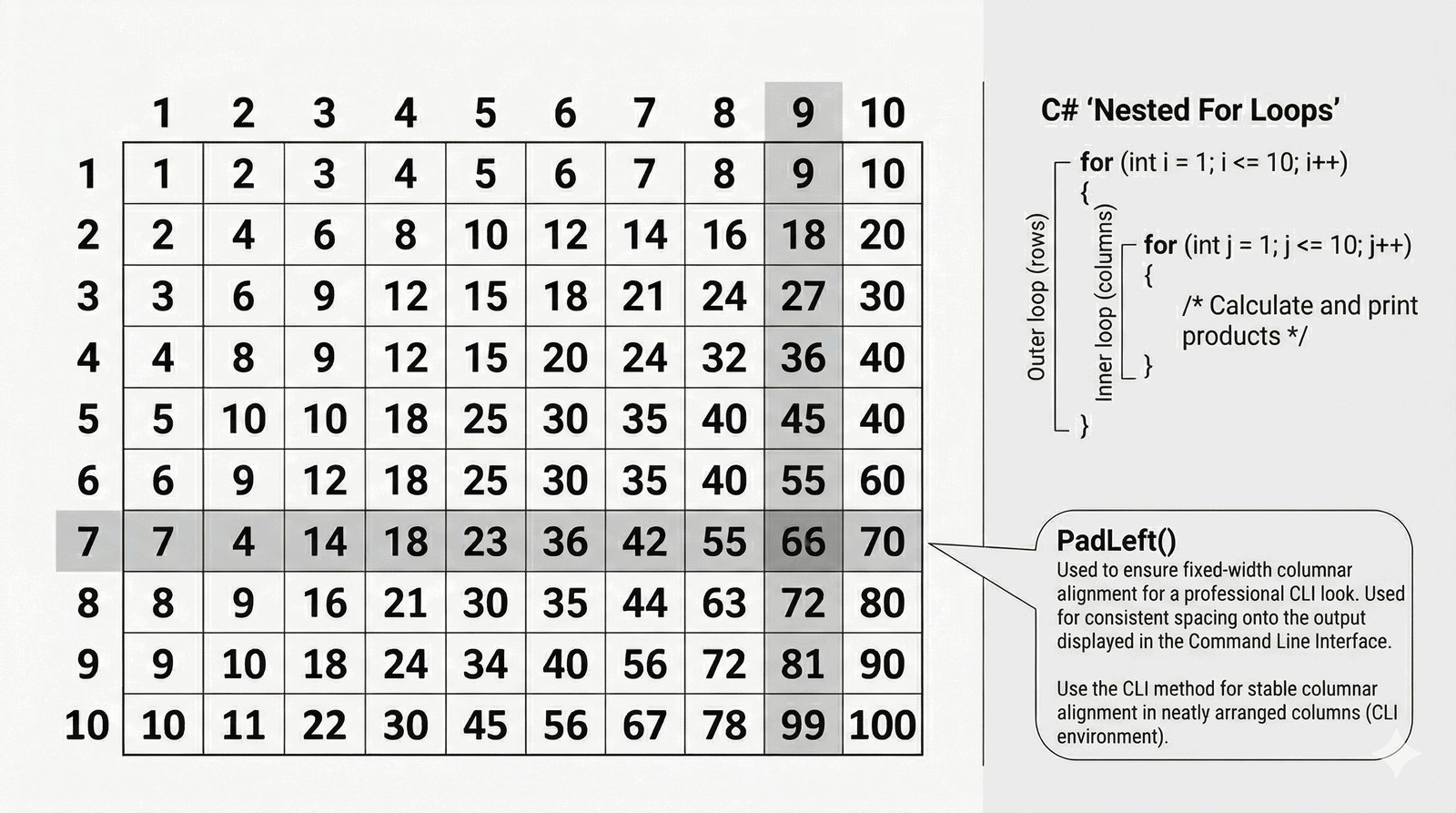 Pętle są jednym z najważniejszych fundamentów programowania, pozwalającym na wielokrotne powtarzanie tych samych operacji. W tym zadaniu stworzysz automatyczny generator tabliczki mnożenia o wymiarach 10x10. Wykorzystasz do tego dwie pętle for – zewnętrzną dla wierszy i wewnętrzną dla kolumn. Każda komórka tabeli powinna być wynikiem mnożenia indeksu wiersza przez indeks kolumny. Aby tabela wyglądała estetycznie i była czytelna, musisz zastosować metodę PadLeft() na wyświetlanym tekście lub użyć odpowiednich manipulatorów formatowania w Console.Write(). Dzięki temu liczby jedno- i dwucyfrowe będą idealnie wyrównane w kolumnach. Zadanie to uczy, jak zarządzać wielowymiarowymi strukturami danych oraz jak dbać o profesjonalny wygląd interfejsu tekstowego, co jest kluczowe w narzędziach konsolowych (CLI).