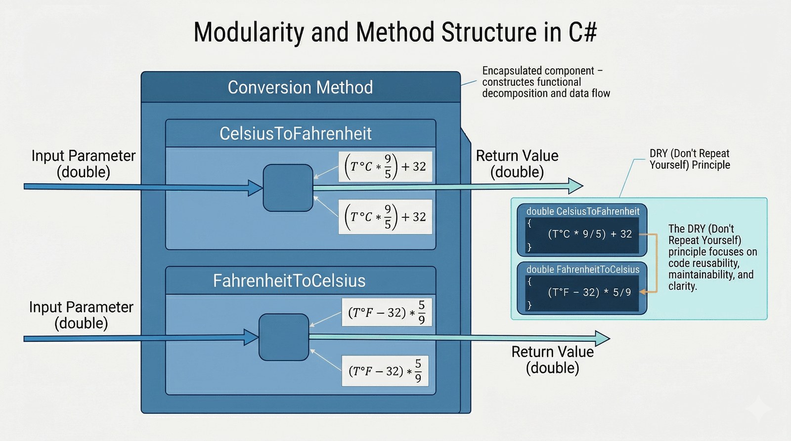 Do tej pory cały kod pisaliśmy wewnątrz jednej głównej metody. W tym zadaniu nauczysz się dzielić program na mniejsze, logiczne części zwane metodami. Stworzysz uniwersalny przelicznik jednostek temperatury, który będzie posiadał dwie oddzielne metody: jedna do zamiany stopni Celsjusza na Fahrenheita, a druga do wykonania odwrotnej operacji. Każda z tych metod musi przyjmować parametr typu double i zwracać wynik tego samego typu. W metodzie głównej (Main) zbudujesz proste menu, które pozwoli użytkownikowi wybrać kierunek konwersji, a następnie wywoła odpowiedni fragment kodu. Zadanie to uczy, jak unikać powtarzania tego samego kodu (zasada DRY – Don't Repeat Yourself) oraz jak zarządzać przepływem danych między różnymi częściami aplikacji. To pierwszy krok w stronę tworzenia złożonych systemów o czytelnej i łatwej w utrzymaniu architekturze.
