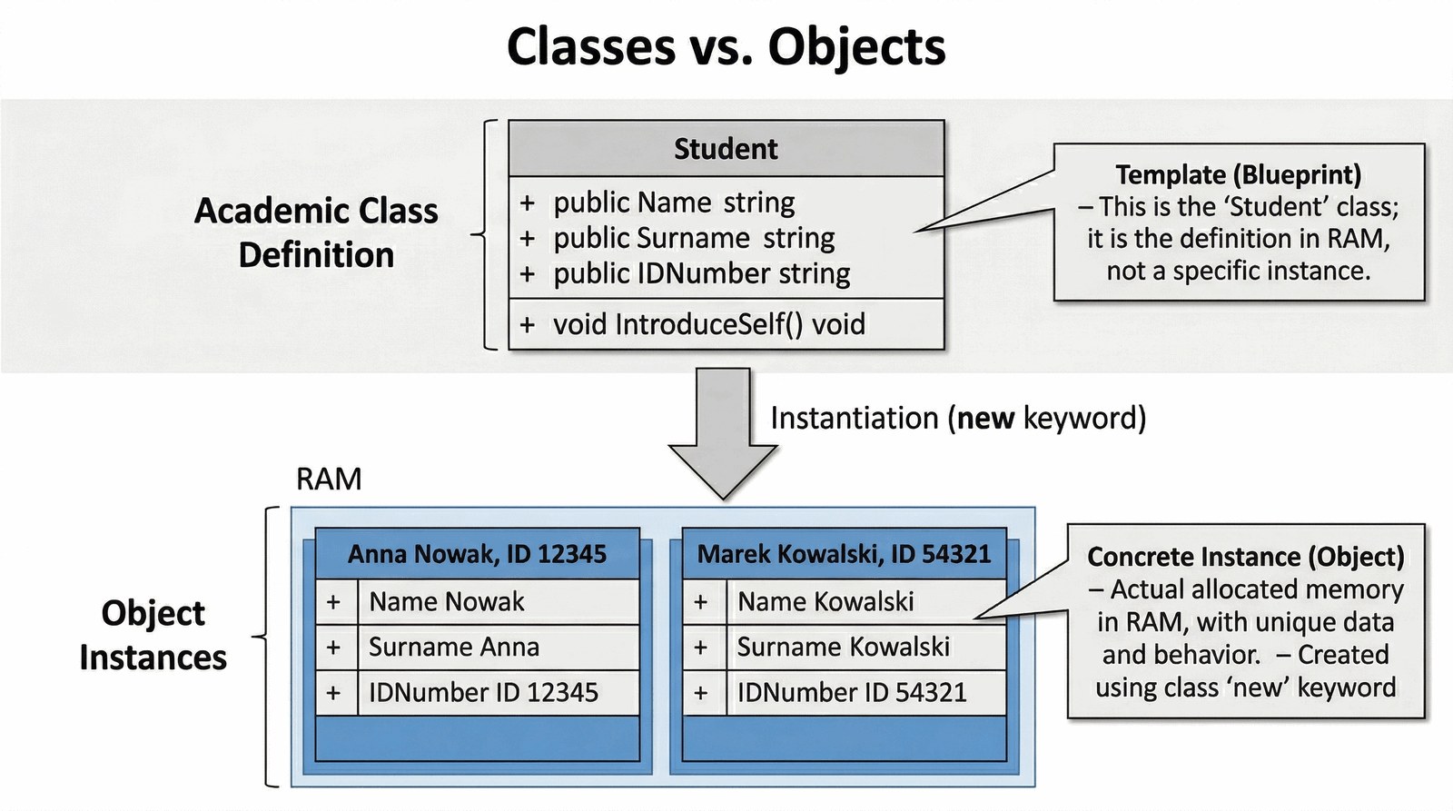 Programowanie obiektowe (OOP) to paradygmat, w którym dane i funkcje są łączone w spójne całości zwane obiektami. W tym zadaniu Twoim celem jest zamodelowanie klasy Student, która będzie przechowywać informacje o imieniu, nazwisku oraz numerze indeksu. Klasa powinna posiadać publiczne pola (lub właściwości) oraz specjalną metodę o nazwie PrzedstawSie(), która wyświetli sformatowane dane studenta na konsoli. W metodzie głównej programu musisz utworzyć (zinstancjonować) co najmniej dwa obiekty tej klasy, przypisać im różne wartości dla pól i wywołać ich metody. Dzięki temu zadaniu zrozumiesz kluczową różnicę między klasą (projektem/szablonem), a obiektem (konkretnym bytem w pamięci komputera). Dowiesz się również, jak hermetyzacją i strukturą kodu można odwzorowywać rzeczywiste obiekty w świecie cyfrowym.