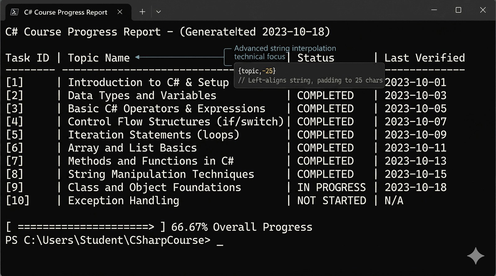 Ostatnie zadanie jest zwieńczeniem kursu podstaw i wymaga połączenia niemal wszystkich poznanych elementów: zmiennych, pętli, instrukcji warunkowych oraz formatowania tekstu. Napiszesz program generujący "Raport z postępów kursu C#". Program powinien pozwolić na wprowadzenie listy wykonanych zadań (wykorzystując pętlę), a następnie wyświetlić je w formie eleganckiej tabeli z nagłówkiem i stopką. Kluczowe jest użycie zaawansowanej interpolacji ciągów znaków do precyzyjnego wyrównywania kolumn (np. {nazwa,-20}) oraz formatowania dat. Program powinien również obliczać procentowy postęp wszystkich zadań w stosunku do oczekiwanego celu. Zadanie to uczy dbałości o szczegóły oraz pokazuje, jak w prostym środowisku konsolowym można tworzyć profesjonalne raporty danych, które są czytelne i estetyczne dla użytkownika. Jest to doskonały trening przed tworzeniem bardziej zaawansowanych aplikacji biznesowych i systemowych.