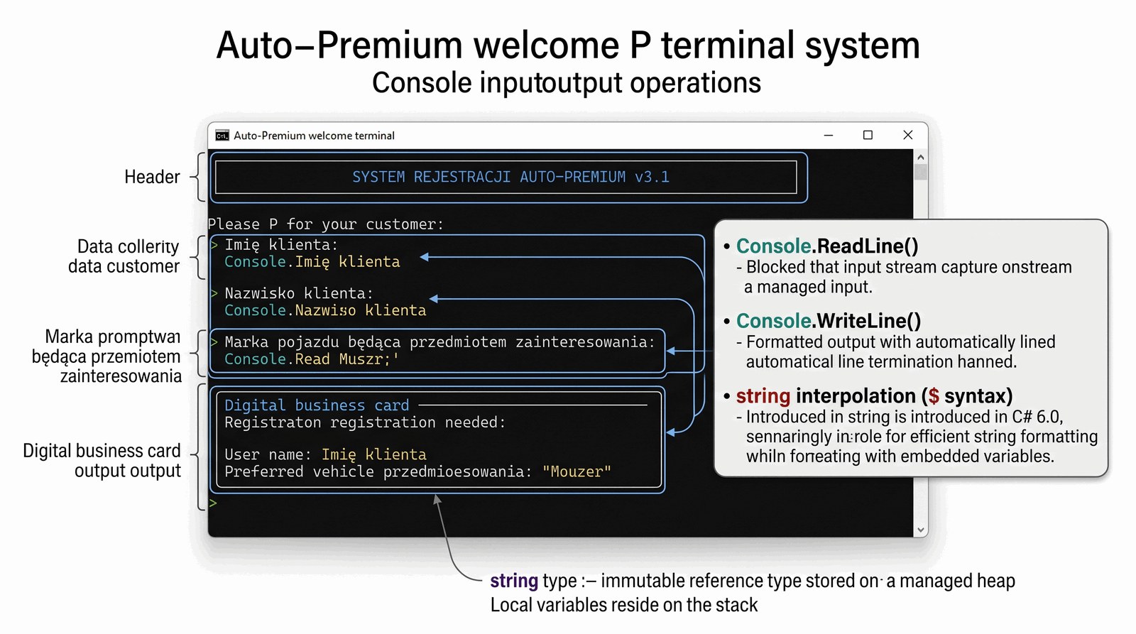 W tym zadaniu fundamentem jest wykorzystanie typu `string`, który w środowisku .NET pełni rolę referencyjnego typu danych przechowującego sekwencje znaków Unicode. Ważne jest zrozumienie, że obiekty typu string są niemutowalne (immutable), co oznacza, że każda próba ich modyfikacji skutkuje utworzeniem nowej instancji w pamięci sterty (Heap). Metoda `Console.ReadLine()` jest odpowiedzialna za przechwycenie strumienia wejściowego i zablokowanie wykonania programu do momentu otrzymania znaku nowej linii. Zwracana wartość jest zawsze typu tekstowego, co wymusza na programiście dbałość o poprawne typowanie w dalszych etapach. Zastosowana interpolacja ciągów znaków (znaki $ przed cudzysłowem) jest mechanizmem wprowadzonym w C# 6.0, który znacząco zwiększa czytelność kodu w porównaniu do klasycznej konkatenacji. Podczas kompilacji, interpolowany string jest zamieniany na wywołanie metody `string.Format`, co optymalizuje proces budowania komunikatów. Przestrzeń nazw `System` dostarcza klasę `Console`, która jest statycznym interfejsem do interakcji z terminalem systemowym. Należy zwrócić uwagę na różnicę między `Write` a `WriteLine` – ta druga metoda automatycznie dodaje ogranicznik linii charakterystyczny dla danego systemu operacyjnego. Prawidłowe nazewnictwo zmiennych (camelCase) sprzyja utrzymaniu standardów czystego kodu (Clean Code). Wykorzystanie znaków ucieczki, takich jak `\n`, pozwala na precyzyjne sterowanie layoutem tekstowym w konsoli. Pamięć alokowana dla zmiennych lokalnych w metodzie `Main` znajduje się na stosie (Stack), podczas gdy same dane tekstowe wędrują na stertę. Program demonstruje, jak prosta interakcja z użytkownikiem może być zrealizowana w sposób profesjonalny i wydajny. Każdy element składni służy tutaj budowaniu spójnego i odpornego na błędy interfejsu użytkownika.