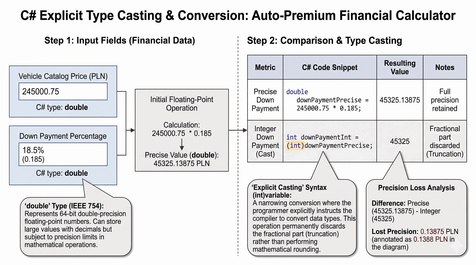 W zadaniu wykorzystujemy typ `double`, który służy do reprezentacji liczb zmiennoprzecinkowych o podwójnej precyzji, zgodnych ze standardem IEEE 754. Ten typ danych alokuje 64 bity w pamięci i pozwala na przechowywanie wartości z dokładnością do 15-17 cyfr znaczących. Napotykamy tu na problem rzutowania jawnego (explicit casting), które polega na wymuszeniu konwersji typu `double` na `int`. Taka operacja powoduje bezpowrotną utratę części ułamkowej liczby (następuje ucięcie, a nie matematyczne zaokrąglenie). Składnia `(int)zmienna` informuje kompilator, że programista jest świadomy ryzyka utraty danych i akceptuje je. Jest to przykład konwersji zwężającej, która musi być wykonana jawnie, aby uniknąć przypadkowych błędów logicznych. Warto zauważyć, że typ `int` jest 32-bitowym typem całkowitym ze znakiem, co nakłada limity na maksymalną wartość przechowywanej kwoty (ok. 2,1 mld). Zmienne te są przechowywane na stosie (Stack), co zapewnia wysoką wydajność dostępu. Operatory arytmetyczne, takie jak mnożenie (`*`), działają na typach zmiennoprzecinkowych z zachowaniem precyzji binarnej. Użycie stałych w kodzie, takich jak stawka procentowa, powinno odbywać się poprzez deklaracje zmiennych pomocniczych dla zwiększenia czytelności. Program pokazuje również, jak interpolacja radzi sobie z różnymi typami danych w jednym wyrażeniu. Metoda `Console.WriteLine` niejawnie wywołuje metodę `ToString()` na każdym obiekcie, który ma zostać wyświetlony. Zrozumienie domyślnego formatowania liczb w zależności od ustawień regionalnych (Culture) jest istotne przy pracy z polskim złotym. Należy pamiętać, że dla systemów finansowych krytycznych wybiera się zazwyczaj typ `decimal`, jednak tutaj `double` służy do demonstracji mechanizmów rzutowania. Każdy krok algorytmu jest zaprojektowany tak, by pokazać przepływ danych od wejścia do przetworzonego wyniku. Wyciąganie wniosków z różnic między wartością dokładną a rzutowaną to kluczowa umiejętność debugowania obliczeń.