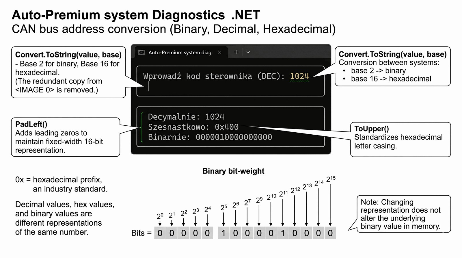 W warsztacie serwisowym Auto-Premium mechanicy korzystają ze specjalistycznych interfejsów diagnostycznych, które komunikują się bezpośrednio z szyną CAN pojazdu. Każdy podzespół elektroniczny identyfikowany jest przez unikalny, dziesiętny numer seryjny, jednak protokoły komunikacyjne operują wyłącznie na kodzie binarnym i szesnastkowym. Twoim zadaniem jest stworzenie narzędzia wspomagającego pracę inżynierów serwisu, które w czasie rzeczywistym dokona konwersji numerów ID na formaty czytelne dla maszyn. Dzięki temu pracownik będzie mógł szybko zweryfikować adresy modułów na magistrali danych, minimalizując ryzyko pomyłki przy programowaniu sterowników silnika. System musi być intuicyjny, ale i dostarczać surowych danych technicznych niezbędnych do niskopoziomowej analizy błędów. Taka funkcjonalność jest niezbędna przy diagnozowaniu skomplikowanych usterek elektroniki w najnowszych modelach aut. Program stanowi most między ludzką percepcją liczb a binarną logiką komputerów pokładowych. To zadanie wprowadza Cię w świat programowania bliskiego sprzętowi.