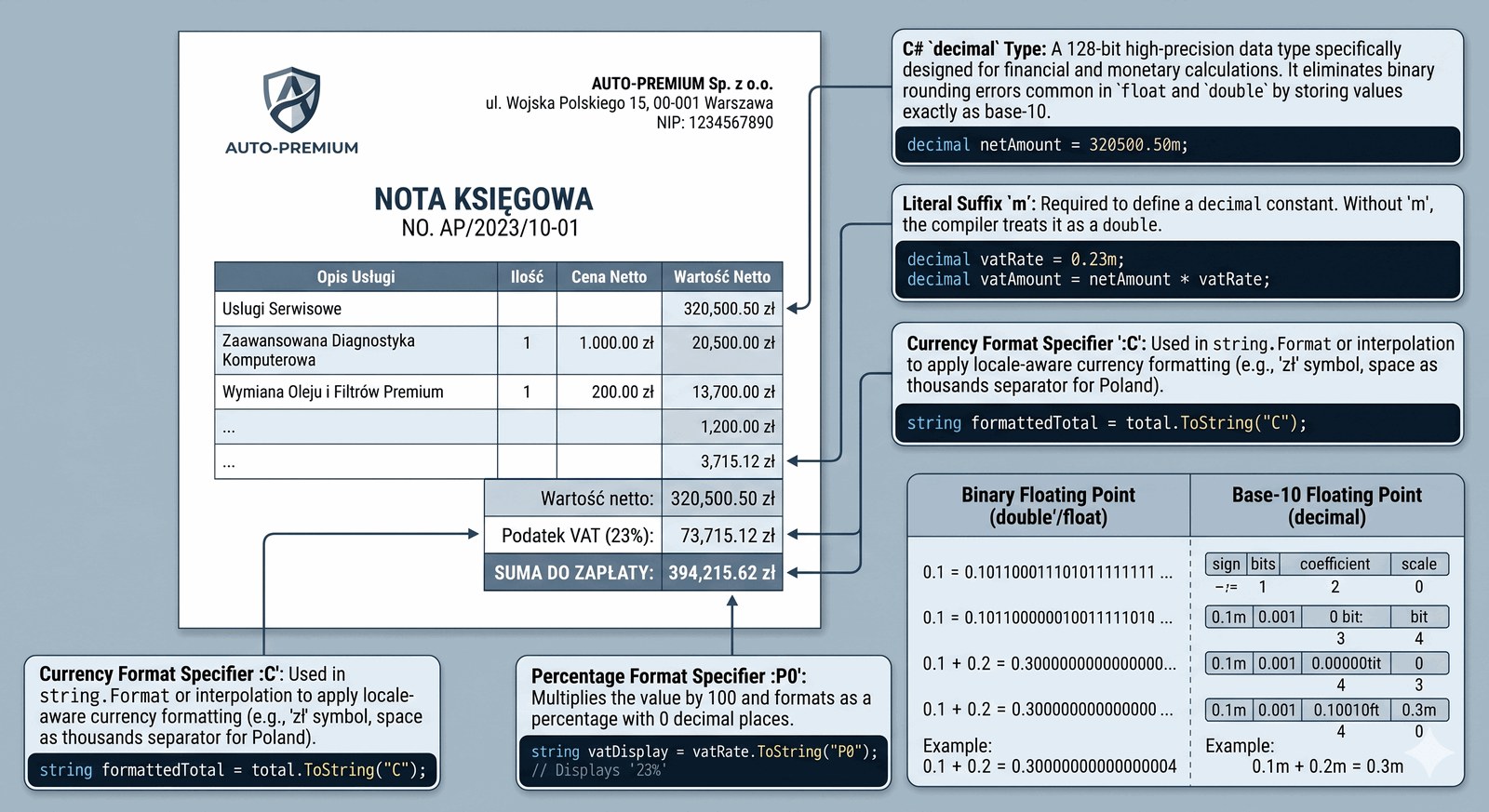 Zaawansowane operacje finansowe w salonie Auto-Premium wymagają bezwzględnej dokładności, szczególnie przy naliczaniu podatku VAT od towarów luksusowych. Nawet najmniejszy błąd wynikający z binarnej reprezentacji ułamków mógłby narazić firmę na dotkliwe kary skarbowe oraz utratę zaufania klientów. Twoim zadaniem jest stworzenie generatora precyzyjnych not księgowych, który operuje na kwotach o wysokiej wartości. System musi przyjmować cenę netto, dynamicznie obliczać wartość podatku oraz sumaryczną kwotę brutto. Kluczowym wymaganiem jest, aby raport był czytelny dla międzynarodowych audytorów, dlatego symbol waluty oraz separator dziesiętny muszą być zgodne z lokalnymi ustawieniami systemowymi. Każda pozycja na fakturze musi być wyraźnie opisana i sformatowana w sposób uniemożliwiający błędną interpretację liczb. Prezentowane dane finansowe mają odzwierciedlać profesjonalizm i dbałość o detal, z których słynie marka Auto-Premium. System ten będzie wykorzystywany przy finalizacji umów sprzedaży najdroższych pojazdów w ofercie. Skupiasz się tutaj na eliminacji błędów numerycznych za pomocą dedykowanych typów danych języka C#.