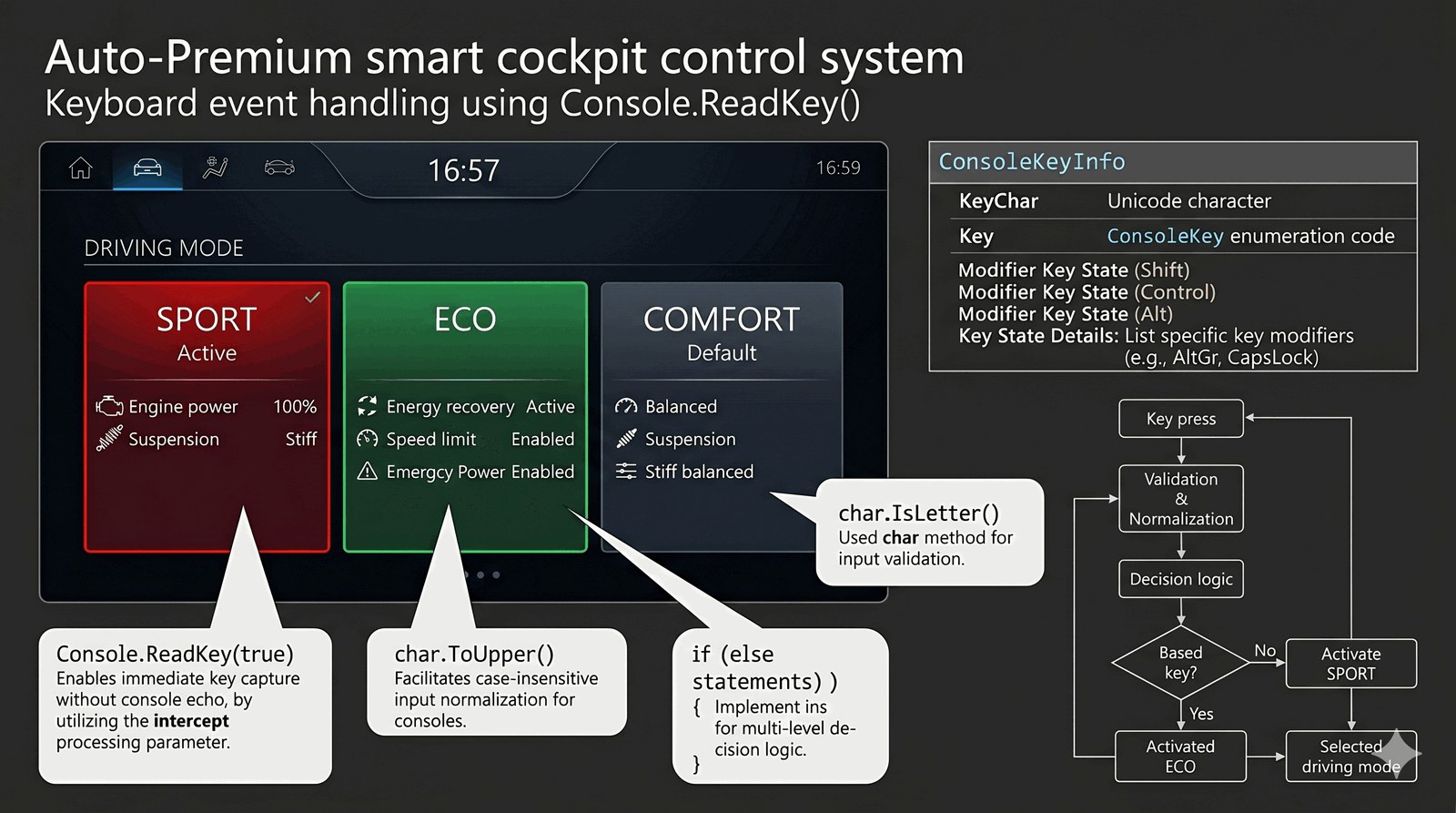 Kluczowym elementem tego zadania jest metoda `Console.ReadKey(bool intercept)`, która różni się znacząco od popularnego `ReadLine`. Parametr `true` powoduje, że naciśnięty klawisz nie jest wyświetlany (echo) w konsoli, co jest istotne przy budowie interfejsów sterujących lub pól haseł. Metoda ta zwraca strukturę `ConsoleKeyInfo`, która zawiera szczegółowe informacje o zdarzeniu klawiatury: właściwość `KeyChar` (reprezentacja znakowa Unicode), `Key` (kod klawisza z wyliczenia `ConsoleKey`) oraz status klawiszy modyfikujących (Shift, Alt, Ctrl). Typ danych `char` reprezentuje pojedynczy znak 16-bitowy zakodowany w formacie UTF-16, co pozwala na obsługę szerokiej gamy symboli międzynarodowych. Wykorzystujemy metodę statyczną `char.ToUpper()`, która zapewnia poprawną normalizację wielkości liter niezależnie od tego, czy użytkownik użył klawisza Caps Lock. Instrukcja warunkowa `if` analizuje logicznie wartość znaku, pozwalając na rozgałęzienie algorytmu w zależności od wyboru kierowcy. Metoda `char.IsLetter()` jest przykładem walidacji semantycznej danych, odróżniającej znaki alfabetu od cyfr czy symboli specjalnych. Wewnątrz instrukcji warunkowych stosujemy operatory porównania `==` do precyzyjnej identyfikacji opcji. Zagnieżdżone bloki kodu pozwalają na wielopoziomową logikę decyzyjną, charakterystyczną dla maszyn stanów. Należy pamiętać, że `Console.ReadKey` jest operacją blokującą – wątek programu zatrzymuje się w oczekiwaniu na sygnał przerwania z kontrolera klawiatury. Jest to świetny wstęp do zrozumienia programowania sterowanego zdarzeniami (Event-Driven Programming). Struktura `ConsoleKeyInfo` jest typem wartościowym, co oznacza, że jest kopiowana przy przekazywaniu, ale jej lekkość sprawia, że jest idealna do takich szybkich operacji. Prawidłowa obsługa znaków specjalnych chroni program przed awarią przy przypadkowym naciśnięciu klawiszy funkcyjnych. Całość tworzy interaktywną pętlę komunikacji człowiek-maszyna.