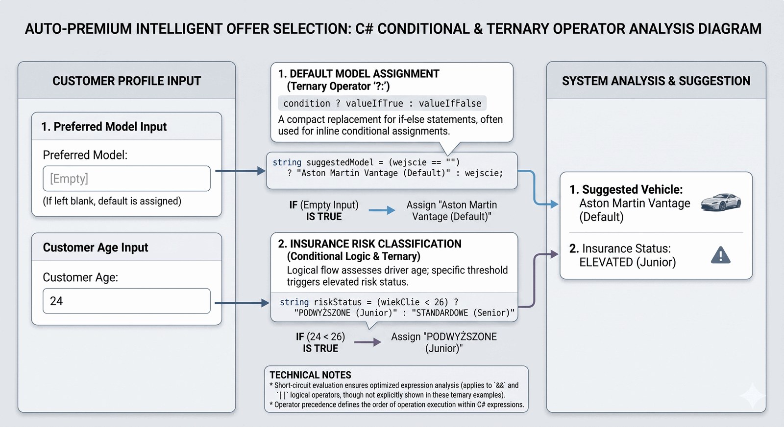 Zadanie koncentruje się na dwóch potężnych operatorach: trójargumentowym operatorze warunkowym `? :` oraz operatorze null-coalescing `??`. Operator trójargumentowy jest skróconą formą instrukcji `if-else`, która pozwala na przypisanie wartości do zmiennej w jednej linii na podstawie warunku logicznego. Składa się on z trzech części: wyrażenia boolowskiego, wartości zwracanej przy prawdzie i wartości zwracanej przy fałszu. Zwiększa to czytelność kodu poprzez eliminację zbędnych klamer i wielokrotnych instrukcji przypisania. Operator `??` (null-coalescing) służy do obsługi wartości brakujących (null). W tym przypadku symulujemy go poprzez sprawdzenie pustego stringa za pomocą operatora warunkowego, gdyż `Console.ReadLine()` rzadko zwraca czysty null. Należy zrozumieć mechanizm "short-circuiting", gdzie w operatorach logicznych druga część warunku może nie zostać sprawdzona, jeśli wynik jest już znany. W C# operatory te są niezwykle wydajne, gdyż kompilator optymalizuje je do prostych skoków w kodzie maszynowym. Wykorzystanie tych konstrukcji pozwala na budowanie tzw. płynnego kodu (Fluent Code). Właściwość `string.IsNullOrEmpty()` byłaby tu alternatywą, lecz operator trójargumentowy daje większą kontrolę nad procesem mapowania wartości. Zmienne lokalne, takie jak `model` czy `ryzyko`, posiadają ograniczony zasięg (scope) do metody `Main`, co sprzyja bezpieczeństwu pamięci. Warto zauważyć, że operator `? :` ma niższą priorytetowość niż operatory arytmetyczne, co wymaga uwagi przy budowaniu złożonych wyrażeń. Zastosowanie tych technik redukuje tzw. "Code Smell" w postaci nadmiernie rozbudowanych drabinek `if-else`. Program uczy, jak mapować wymagania biznesowe (np. próg wieku 25 lat) bezpośrednio na zwięzłe wyrażenia logiczne. Precyzyjne formatowanie komunikatów z użyciem stałych tekstowych pomaga w standaryzacji odpowiedzi systemu. Pamięć alokowana dla wyników tych operacji jest zarządzana automatycznie przez Garbage Collector, jednak optymalna logika minimalizuje liczbę tworzonych obiektów tymczasowych. Rezultatem jest kod, który jest nie tylko funkcjonalny, ale i estetycznie poprawny z punktu widzenia doświadczonego inżyniera C#.