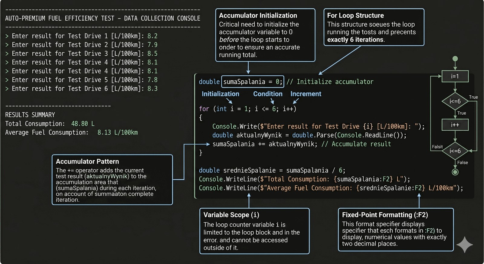 W zadaniu wykorzystujemy pętlę `for`, która jest podstawową konstrukcją iteracyjną w języku C$, pozwalającą na wykonanie bloku kodu określoną liczbę razy. Pętla składa się z trzech sekcji: inicjalizacji licznika, warunku kontynuacji oraz kroku iteracji (inkrementacji). Inicjalizacja `int i = 1` tworzy zmienną sterującą na stosie, która jest dostępna wyłącznie wewnątrz bloku pętli (ograniczony zasięg). Warunek `i <= 6` jest sprawdzany przed każdym wykonaniem obrotu pętli; jeśli zwróci `false`, pętla zostaje natychmiast przerwana. Akumulacja danych odbywa się w zmiennej `sumaSpalania` typu `double`, która działa jako akumulator (sumator). Bardzo ważne jest zainicjalizowanie akumulatora wartością `0` przed wejściem do pętli, w przeciwnym razie kompilator zgłosi błąd użycia nieprzypisanej zmiennej. Wewnątrz pętli stosujemy operator przypisania złożonego `+=`, który jest syntaktycznym skrótem dla `suma = suma + wartosc`. Metoda `double.Parse()` służy do konwersji tekstu z konsoli na liczbę zmiennoprzecinkową, uwzględniając lokalne separatory dziesiętne. Średnia arytmetyczna obliczana jest po wyjściu z pętli poprzez pojedyncze dzielenie sumy przez liczbę iteracji. Zastosowanie specyfikatora formatu `:F2` w interpolacji zapewnia, że wynik zostanie zaokrąglony do dwóch miejsc po przecinku, co jest standardem w raportach inżynierskich. Należy zwrócić uwagę na koszt wydajnościowy pętli – w tym przypadku jest on minimalny, ale dobra praktyka nakazuje minimalizowanie operacji wejścia/wyjścia wewnątrz ciasnych pętli. Pętla `for` jest tutaj lepszym wyborem niż `while`, ponieważ liczba powtórzeń jest z góry znana i stała. Zmienna sterująca `i` jest często wykorzystywana do numerowania komunikatów tekstowych wyświetlanych użytkownikowi. Program demonstruje, jak proste struktury sterujące mogą zastąpić setki linii powtarzalnego kodu. Wiedza o tym, jak procesor zarządza skokami (JUMP) na poziomie niskopoziomowym, pomaga pisać bardziej optymalne pętle w przyszłości. Każdy element składni przybliża studenta do zrozumienia algorytmiki sekwencyjnej.