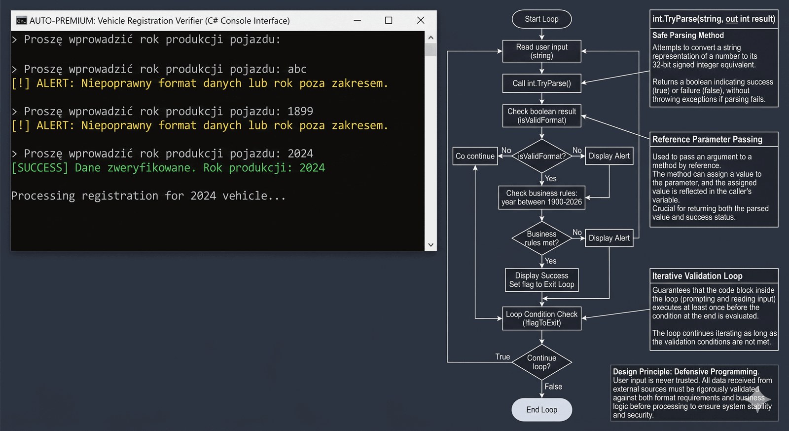 Centralnym punktem tego zadania jest mechanizm `int.TryParse(string s, out int result)`, który jest bezpieczną alternatywą dla metody `Parse`. Metoda ta zwraca wartość typu `bool`, wskazującą czy operacja zamiany tekstu na liczbę zakończyła się sukcesem, co zapobiega rzucaniu wyjątków (brak awarii programu). Kluczowym słowem jest tu `out`, które oznacza przekazanie parametru przez referencję wyjściową – wynik konwersji zostanie zapisany w podanej zmiennej pod warunkiem pomyślnego parsowania. Wykorzystujemy pętlę `do-while`, która gwarantuje wykonanie bloku kodu przynajmniej raz, a jej warunek końcowy sprawdzany jest dopiero po wykonaniu iteracji. Wewnątrz pętli stosujemy instrukcję `if` z operatorem negacji `!`, aby zareagować tylko w przypadku niepowodzenia konwersji. Zmienna logiczna `sukces` steruje przepływem pętli, tworząc tzw. pętlę nieskończoną z warunkiem wyjścia. To podejście jest znacznie bardziej wydajne i eleganckie niż stosowanie bloków `try-catch` dla prostych operacji wejścia. Należy zauważyć, że zmienna przekazywana przez `out` nie musi być zainicjalizowana przed wywołaniem metody, co upraszcza deklaracje. Pamiętaj o obsłudze zakresów danych – samo sprawdzenie czy to liczba to połowa sukcesu, warto też dodać warunki sprawdzające czy rok mieści się w logicznym przedziale (np. 1900-2026). Zastosowanie metody `Console.ReadLine()` zapewnia pobranie świeżego wejścia w każdej iteracji pętli. Całość konstrukcji uczy defensywnego stylu programowania (Defensive Programming), który zakłada, że użytkownik zawsze może popełnić błąd. Profesjonalne aplikacje biznesowe opierają się na takich weryfikatorach na każdym etapie przetwarzania. Wiedza o tym, jak powstają błędy parsowania, pozwala lepiej projektować formularze w interfejsach graficznych. Mechanizm ten jest wspólny dla wszystkich typów numerycznych w .NET (double, decimal, long itd.), co nadaje mu charakter uniwersalny.