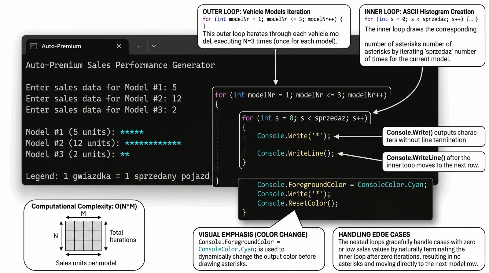 W zadaniu wykorzystujemy zagnieżdżenie pętli (nested loops), czyli sytuację, w której jedna pętla `for` znajduje się wewnątrz bloku innej pętli `for`. Pętla zewnętrzna służy do iteracji po wierszach danych (w naszym przypadku po kolejnych modelach aut), natomiast pętla wewnętrzna odpowiada za operacje w poziomie – rysowanie odpowiedniej liczby znaków graficznych. Każdy obieg pętli zewnętrznej powoduje pełne wykonanie wszystkich powtórzeń pętli wewnętrznej. Jest to mechanizm o złożoności obliczeniowej kwadratowej O(N*M), co w przypadku małych danych konsolowych jest niezauważalne, ale stanowi ważny koncept teoretyczny. Bardzo istotne jest użycie metody `Console.Write()` wewnątrz pętli wewnętrznej, aby znaki były drukowane obok siebie bez przejścia do nowej linii. Po zakończeniu pracy pętli wewnętrznej, sterowanie wraca do pętli zewnętrznej, która wywołuje `Console.WriteLine()`, aby przygotować terminal na kolejny wiersz raportu. Zmienne sterujące w obu pętlach (zwyczajowo `i` oraz `j`) muszą mieć unikalne nazwy, aby nie dochodziło do konfliktów logicznych w zakresie zmiennych. Kod demonstruje również odczyt danych wejściowych w każdym kroku pętli zewnętrznej, co pozwala na dynamiczne sterowanie limitami pętli wewnętrznej. Wykorzystujemy typ `int` do przechowywania liczników oraz wartości sprzedaży, co zapewnia optymalną wydajność operacji skoku. Tekstowe separatory i nagłówki pomagają w budowie strukturalnej wizualizacji. Możliwość zmiany koloru czcionki (`Console.ForegroundColor`) dodatkowo wzbogaca wizualnie generowany histogram. Pamiętaj o obsłudze bardzo niskich lub zerowych wartości, które mogą skutkować pustymi wierszami. Całość algorytmu uczy precyzyjnego zarządzania kursorem w środowisku tekstowym. Takie wzorce są powszechnie stosowane przy generowaniu wykresów, macierzy oraz w grafice komputerowej 2D. Zrozumienie relacji między licznikiem zewnętrznym a wewnętrznym to fundament programowania strukturalnego.
