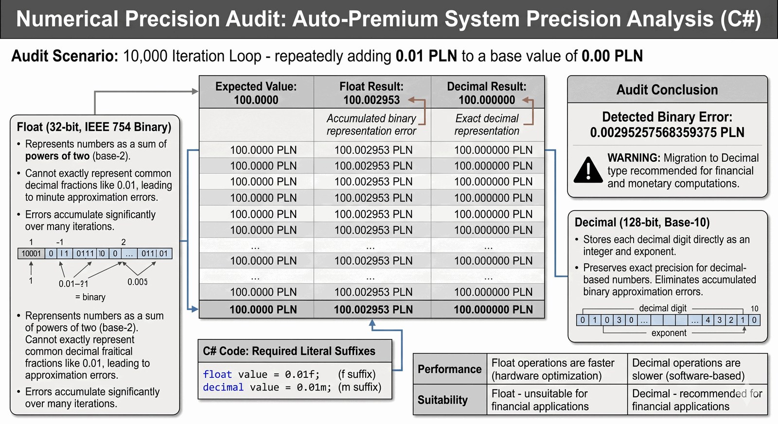 Zarząd Auto-Premium zlecił audyt techniczny systemów finansowych po wykryciu drobnych nieścisłości w zbiorczych raportach rocznych. Podejrzenie padło na niewłaściwy dobór typów danych w algorytmach kumulujących setki tysięcy mikro-transakcji serwisowych. Jako ekspert ds. jakości oprogramowania, musisz przeprowadzić test porównawczy, który ostatecznie rozstrzygnie spór między wydajnością a dokładnością. Twoim zadaniem jest napisanie symulatora, który 10 tysięcy razy doda małą wartość (np. 1 grosz) do sumatora, stosując równolegle typy float oraz decimal. Wynik końcowy ma zostać zestawiony z oczekiwaną matematycznie wartością, ujawniając tym samym naturę błędów binarnych w typach zmiennoprzecinkowych. Taki audyt jest kluczowy dla zachowania integralności finansowej grupy i określenia standardów kodowania dla nowych modułów ERP. Wykazana różnica będzie koronnym dowodem na konieczność stosowania bardziej zasobożernych, ale precyzyjnych typów dziesiętnych. Salon stawia na pełną transparentność finansową, dlatego Twój raport musi być niepodważalny technicznie. Zadanie to kształtuje świadomość inżynierską w zakresie niskopoziomowej reprezentacji liczb w procesorze.